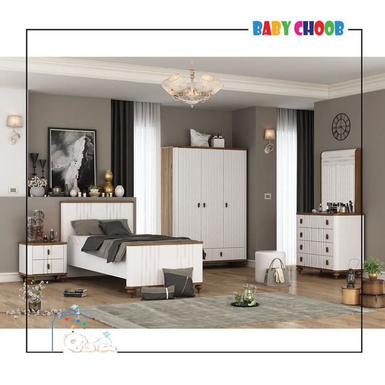 سرویس خواب نوجوان مدل باران با بهترین کیفیت و رعایت تمام اصول ایمنی و استاندارد ساخنه شده است. این سرویس خواب مناسب برای اتاق خواب نوجوان پسرانه می باشد. سرویس اتاق خواب نوجوان مدل باران با ترکیب رنگ سفید و قهوه ای شامل اجزای زیر است: